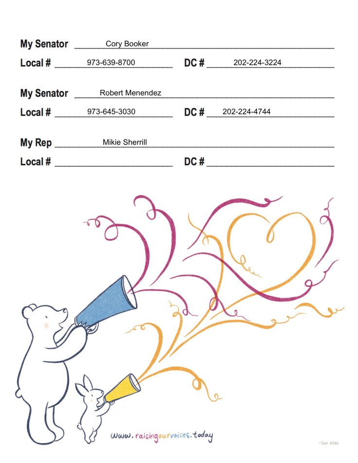 Here’s an example of how you might fill it out — drafted for incoming congressional representative Mikie Sherrill, who was just elected to represent NJ11. Remember, your reps may be changing in January — so feel free to make one poster now, and another in the new year!